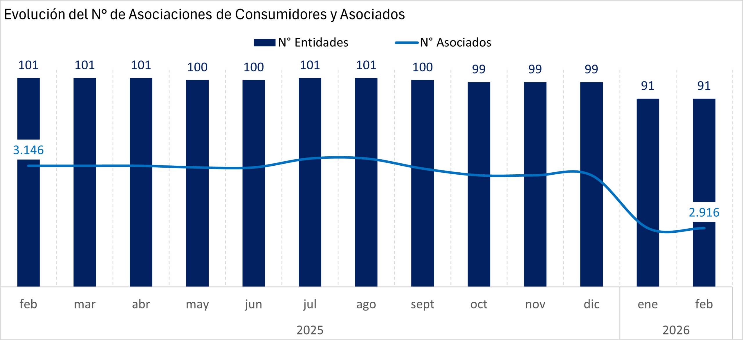 En febrero de 2026, las asociaciones de consumidores activas alcanzaron 91 entidades, registrando una variación interanual de -9,9%. A nivel sectorial, el rubro Servicios concentró 89 organizaciones, con una disminución anual de -9,2%, mientras que el rubro Consumo mantuvo 2 entidades, sin variación respecto del año anterior.