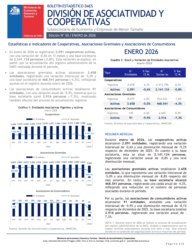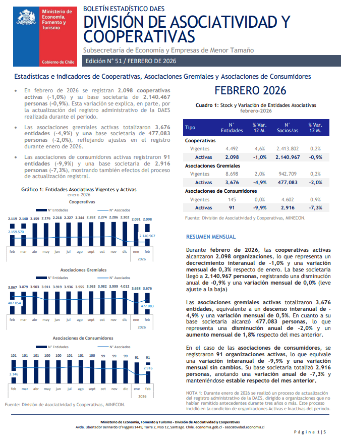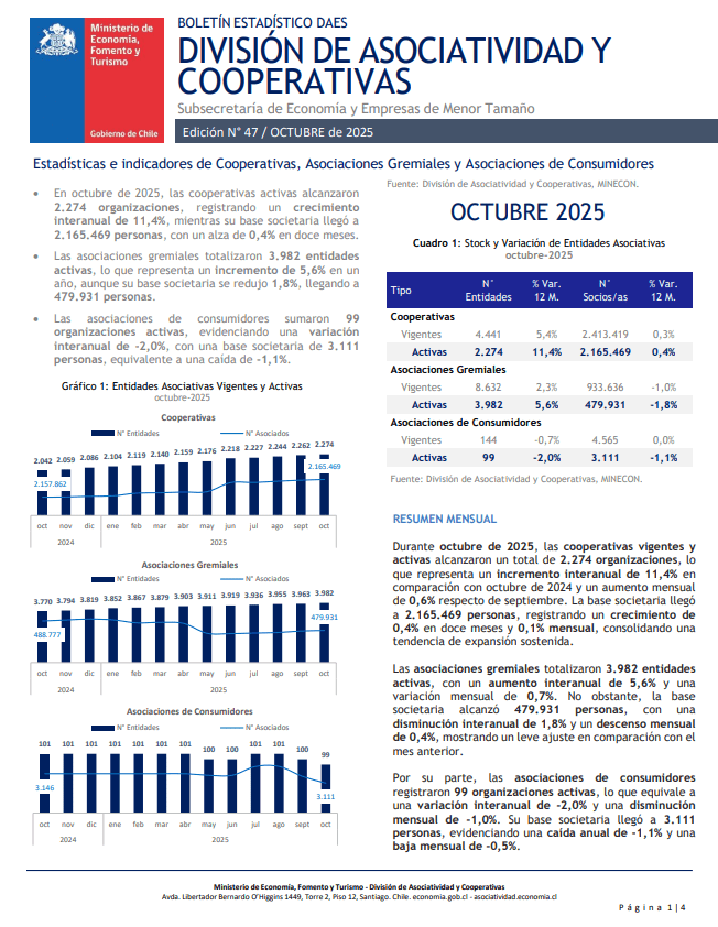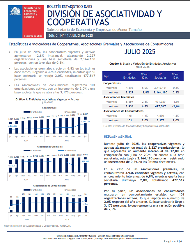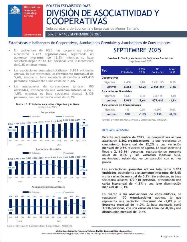 Esta sección proporciona datos cuantitativos y analítica en el marco de las actividades regulares de la División de Asociatividad y Cooperativas del Ministerio de Economía, Fomento y Turismo de Chile.